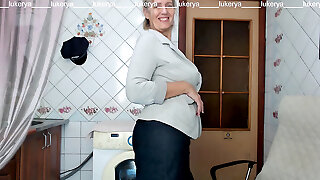 A hot housewife in the kitchen flirts merrily showing her attractive ass and not young natural movable cupcakes that hang a
