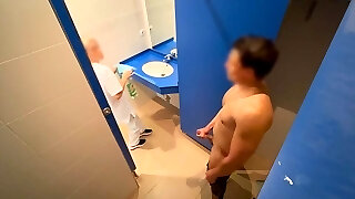 I surprise the cleaning lady at the gym providing me a handjob in the bathroom and she helps me finish spunking with a blowjob