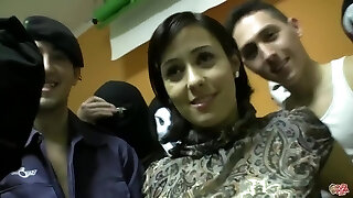 She surrounded by several black knobs and moans with joy when they penetrate all her holes simultaneously
